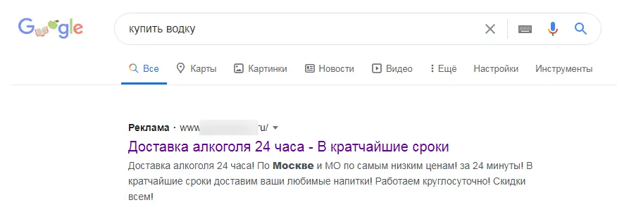 В России нельзя рекламировать алкоголь в Яндексе и Google. Если разместить объявление с заголовком «купить водку», его, скорее всего, отклонят.
