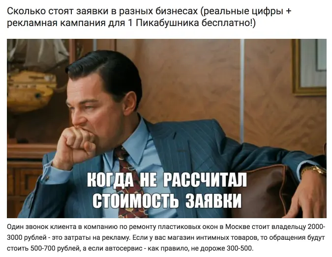 Позднее Илья отметил, что платежеспособность и мотивированность лидов с такого материала существенно выше, чем, например, с такого размещения, хотя суммарное количество заявок с Пикабу было в 5-6 раз больше.