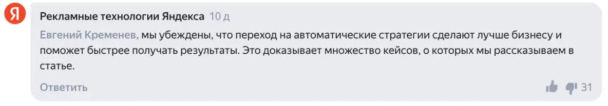 Скриншот из обсуждения новости Яндекса