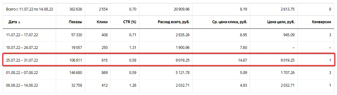 При недельном бюджете придется на каждый ключ получить расход в 3-5 раз выше желаемой цены конверсии — только для оценки, стоит ли их отключать или повышать.