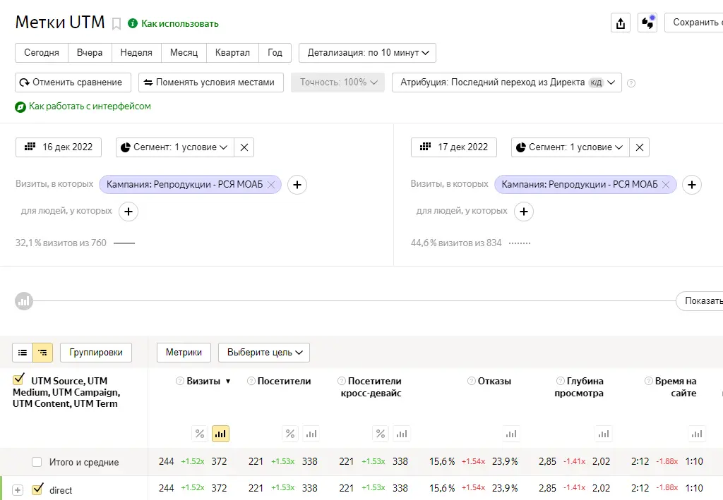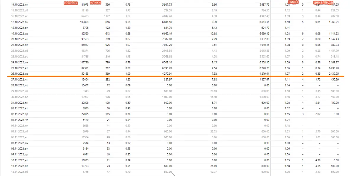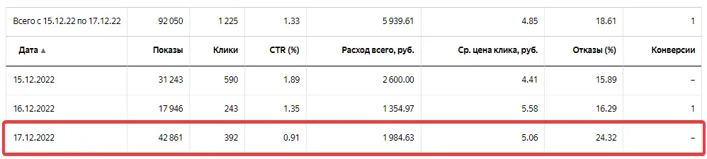 Это полный скрин данных, приведенных выше. Сравнение одного дня, конечно, но показатели на ровном месте так не падают в рекламе, не пара кликов же было, а сотни.