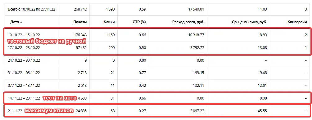 Большой плюс ручной стратегии — быстрый старт. За пару дней легко найти необходимую цену клика для вашего бюджета в большинстве случаев. Из-за того, что все откручивается без остановок и как может — мы видим реальную картину. Стоит ставка 5₽ и у вас расход 2000₽ в день? Значит, можно получать клики еще дешевле (но и расход уменьшится).