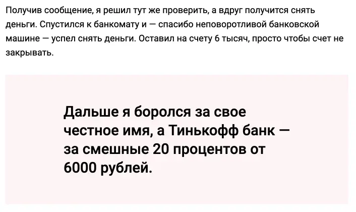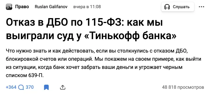 В конце 2020 года к нам пришел клиент с интересной историей. Они выиграли суд у «Тинькофф Банка», поводом была блокировка счета по 115-ФЗ. И хотели написать об этом, чтобы привлечь клиентов с аналогичными проблемами. Тема горячая, кейс интересный, в принципе понятно, что писать и куда нести статью.