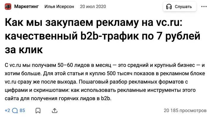 Наш лайфхак: проверять текст на прочность на VC, где живая аудитория покажет, насколько текст привлекателен, а затем дополнять статью продающими врезками и публиковаться там, где мы сможем получить много релевантного трафика. Один текст может быть использован 2-3 раза с вариациями (и разным результатом).