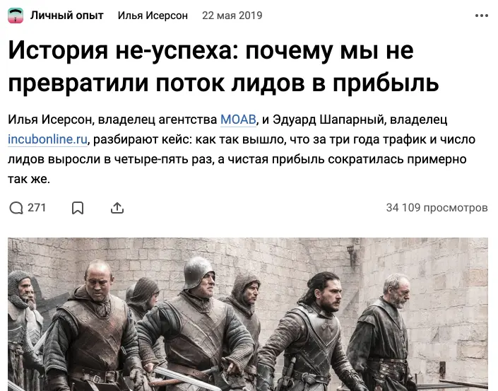 Как и прочие статьи, этот материал прошел наш стандартный путь. Так мы делаем собственные и клиентские статьи. Если все идет по плану, 2 из 3 статей гарантированно генерят лиды, сколько и как — об этом пишет Илья Исерсон в своей статье об итогах 2020.