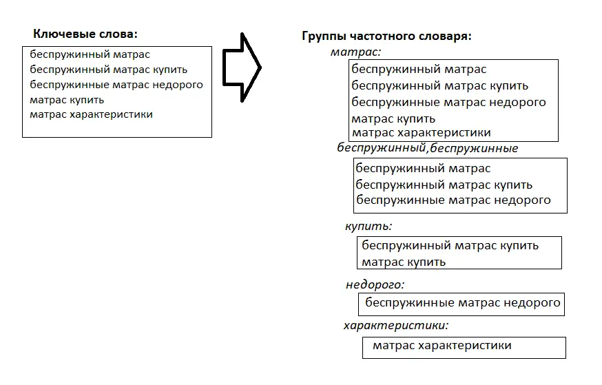 После первичной обработки создается частотный словарь, на основе которого производится быстрая очистка и кластеризация семантики. В словарь входят все уникальные слова из всех ключевых фраз, им сопоставлены группы ключевых фраз, содержащих эти слова.