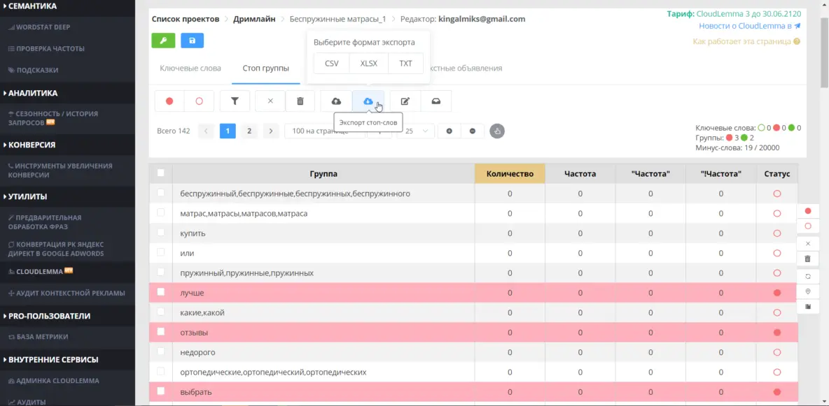 Дополнительно: вообще иногда актуально оставить длинные фразы, чтобы вытянуть из них потенциальные минус-слова, а затем избавиться от них в конце обработки — CloudLemma позволяет сделать и это! Читайте далее.