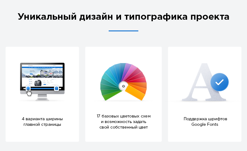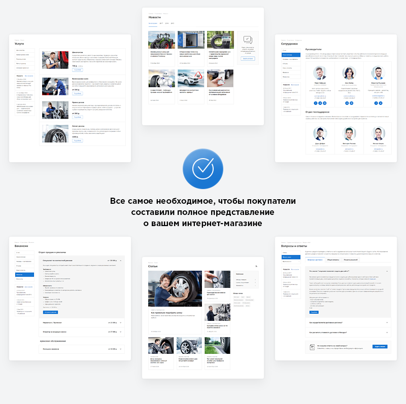 В решении есть все необходимое для создания магазина авто-товаров: от готовых контентных разделов и форм для записи до версии для слабовидящих и набора маркетинговых инструментов.