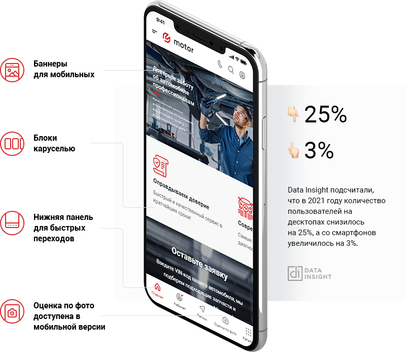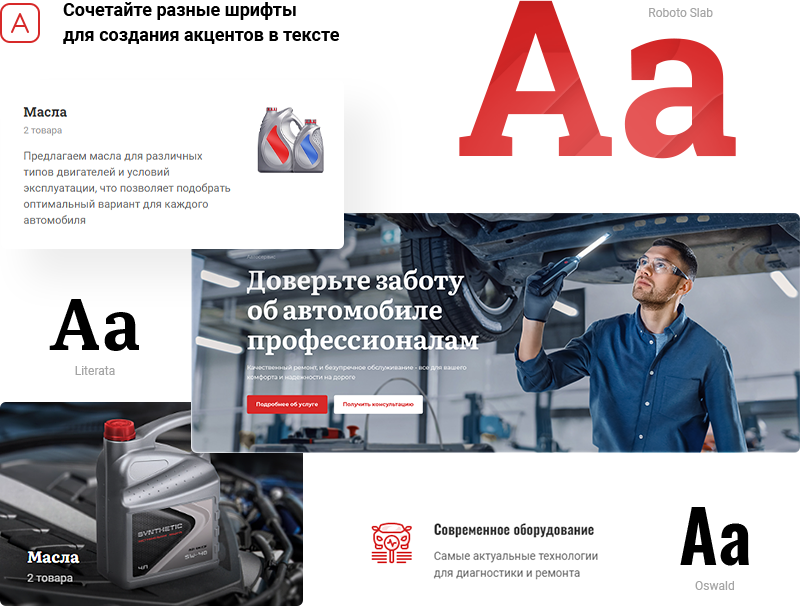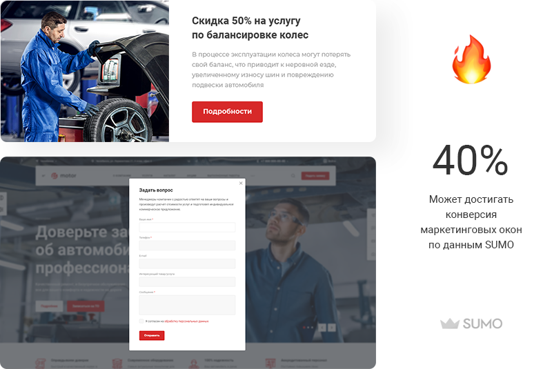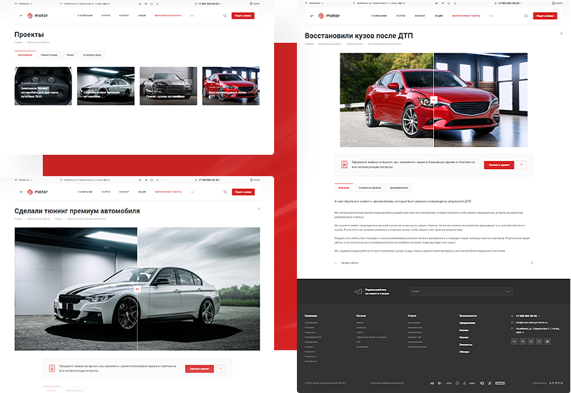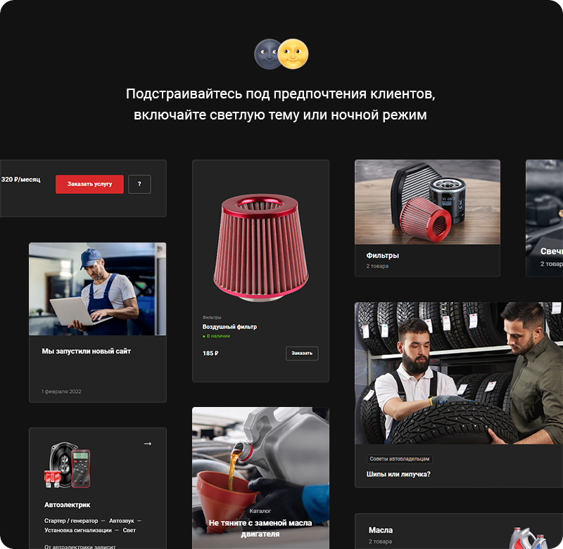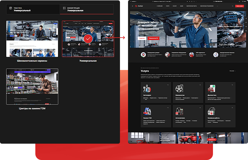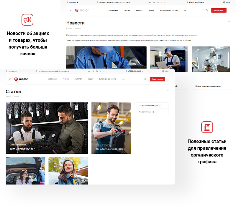 В решении есть все необходимое для сайта автомастерских и шиномонтажей: от готовых контентных разделов и форм для записи до версии для слабовидящих и набора маркетинговых инструментов.