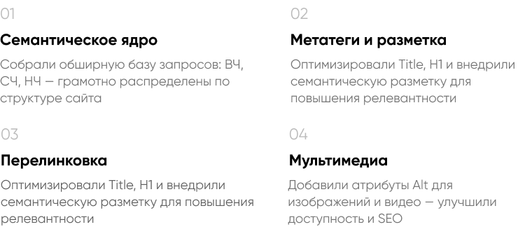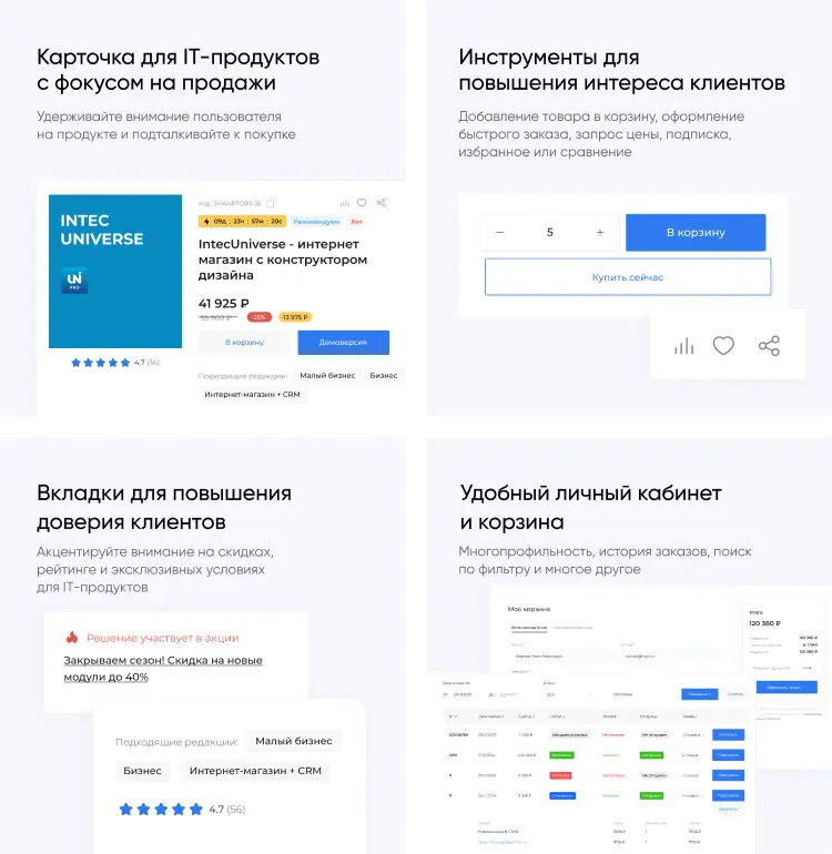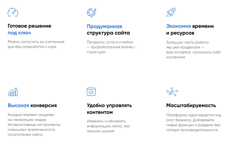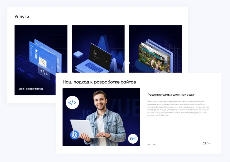 В решении есть все необходимое для сайта интернет-агентств, веб-студий и IT-компаний: от готовых контентных разделов и форм для записи до версии для слабовидящих и набора маркетинговых инструментов.