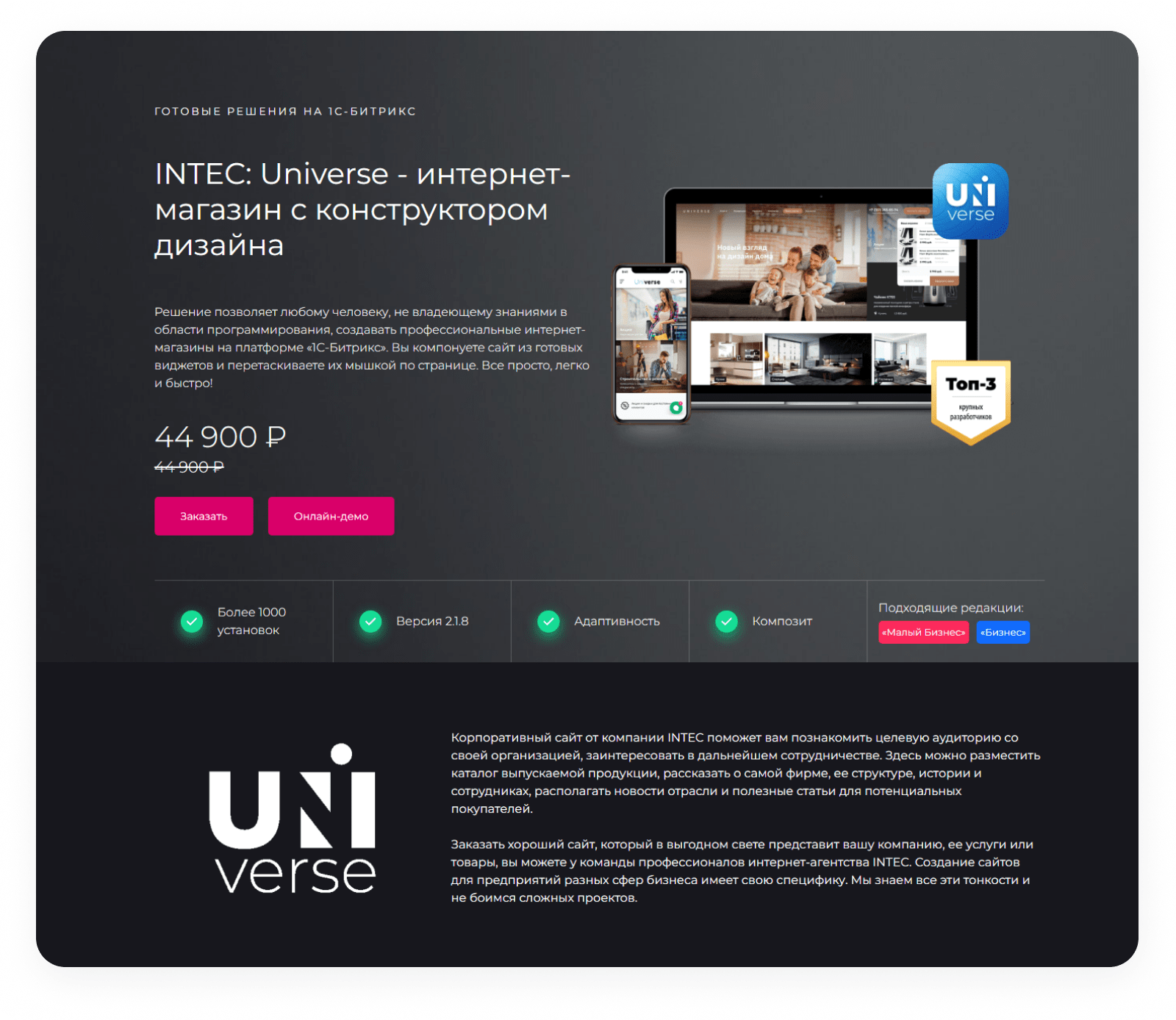 Готовый сайт под ключ за 10 дней на 1С-Битрикс на платформе "INTEC.Digital". Установка, настройка, готовое решение, лицензия, хостинг - все включено!