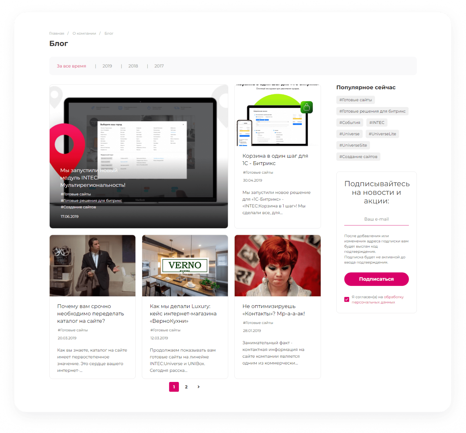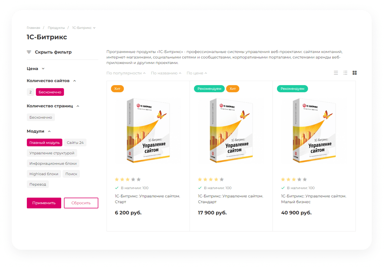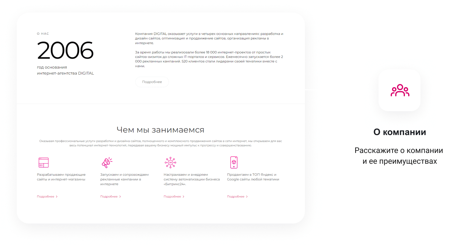 В решении есть все необходимое для digital-бизнеса: от готовых контентных разделов и форм для записи до версии для слабовидящих и набора маркетинговых инструментов.