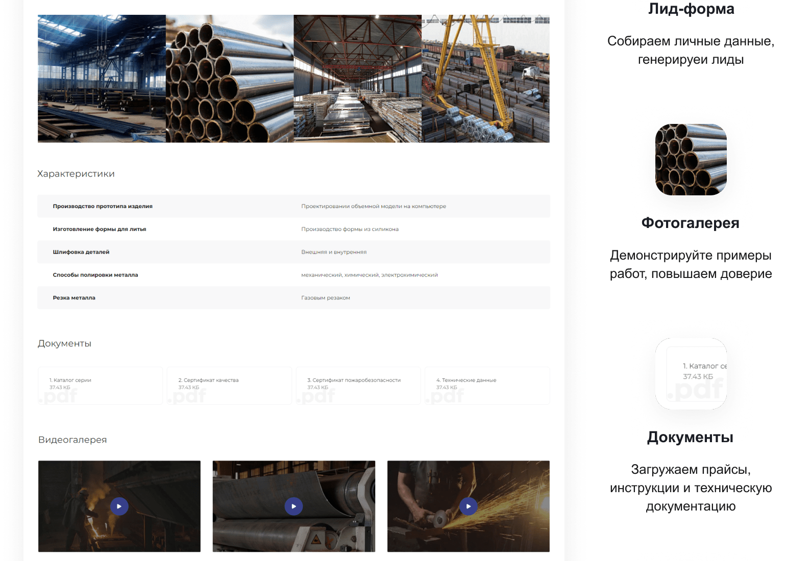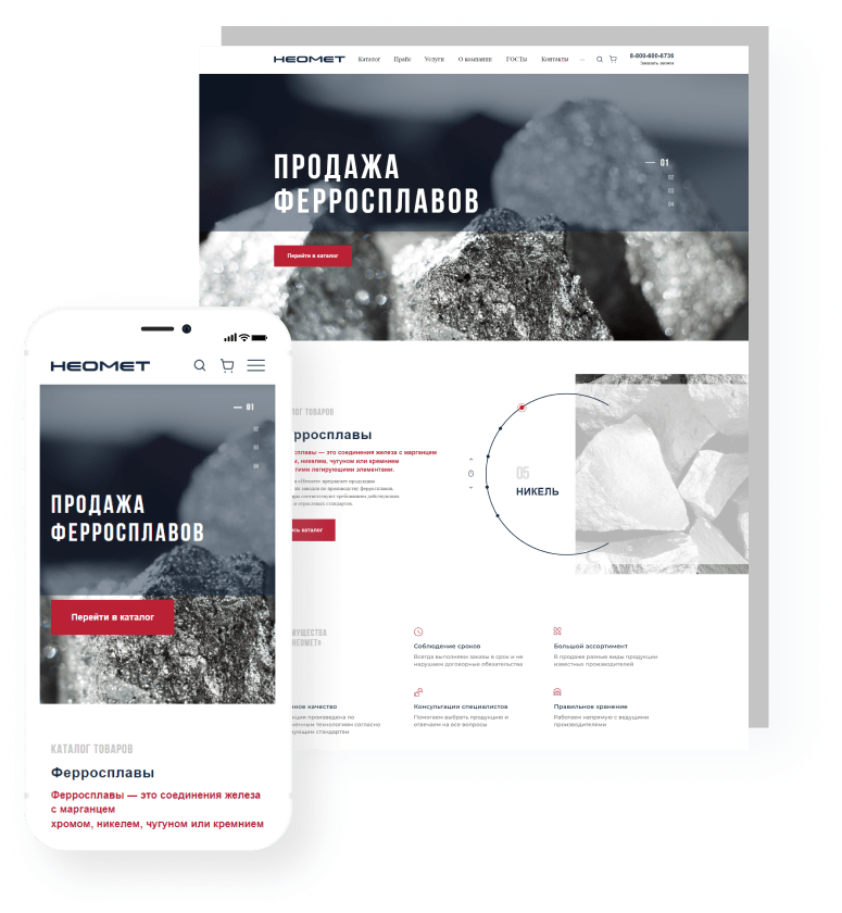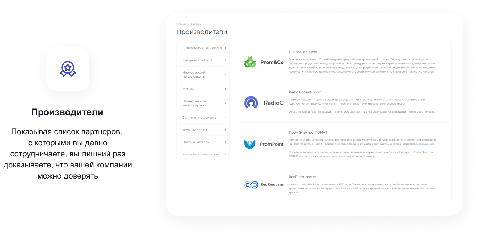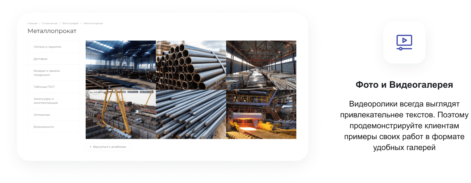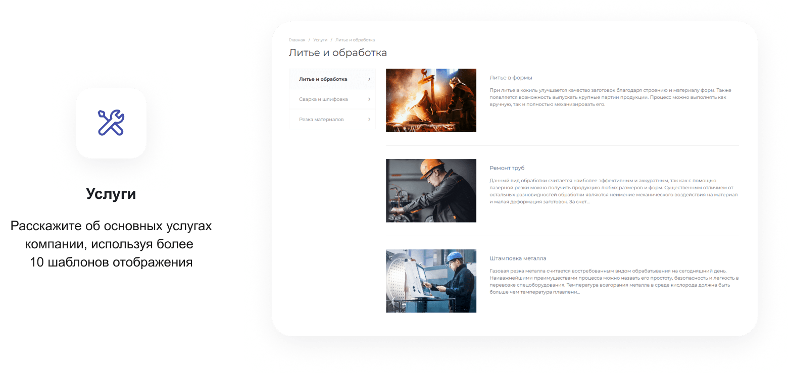 В решении есть все необходимое для сайта металлоторговых и промышленных компаний: от готовых контентных разделов и форм для записи до версии для слабовидящих и набора маркетинговых инструментов.