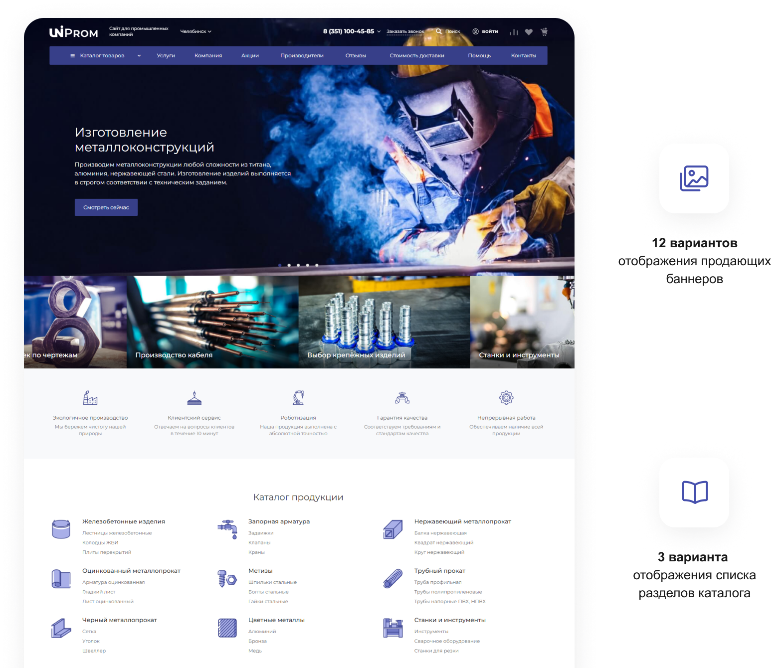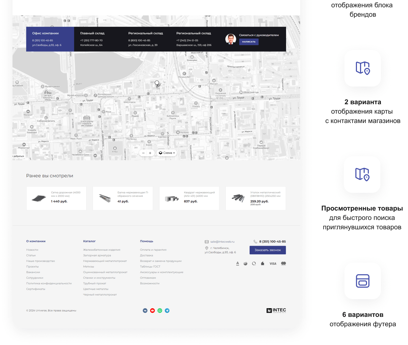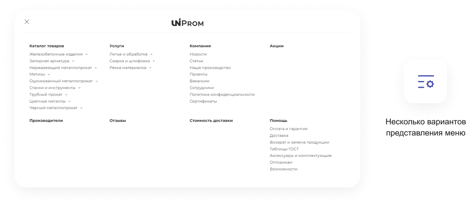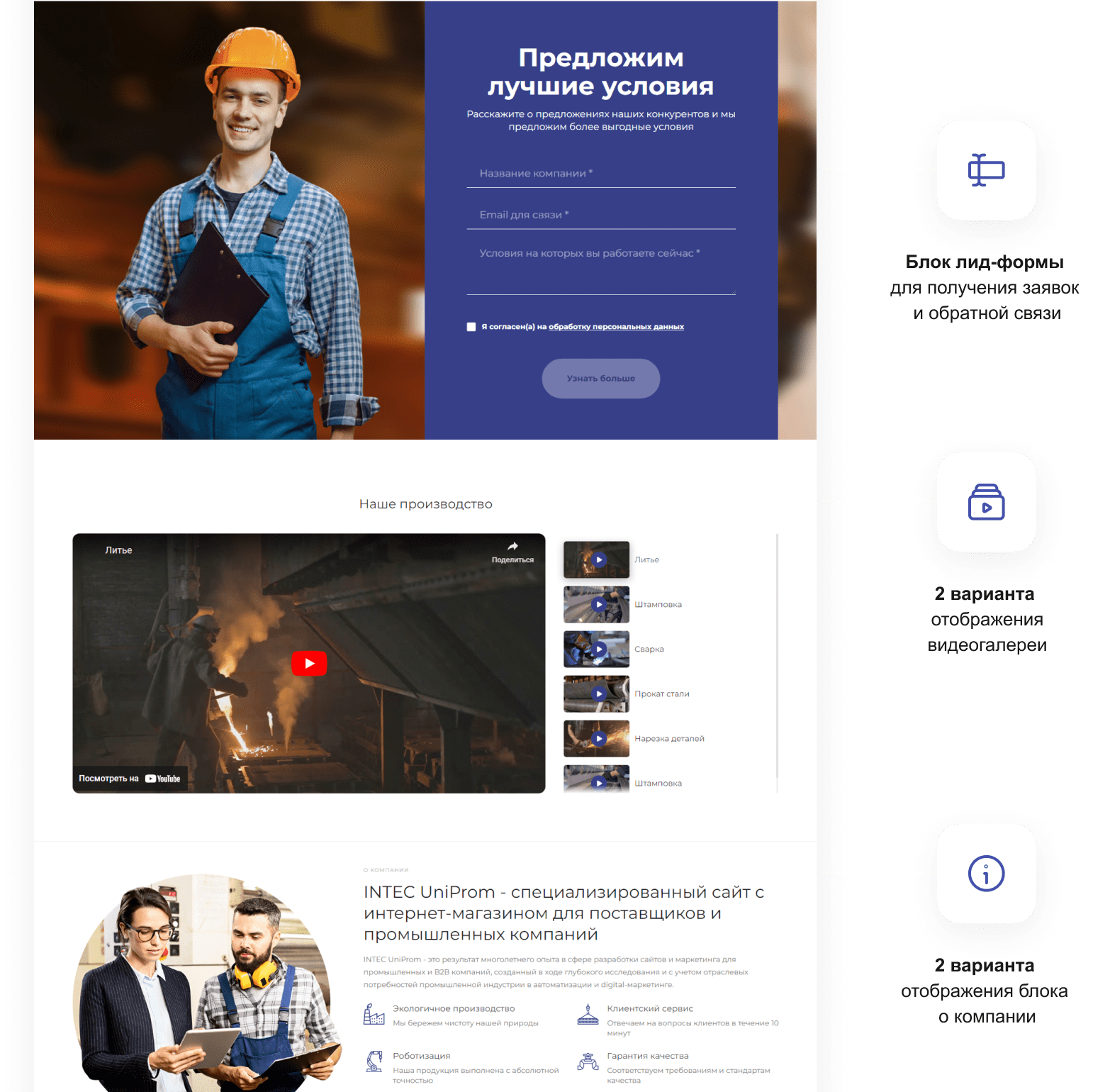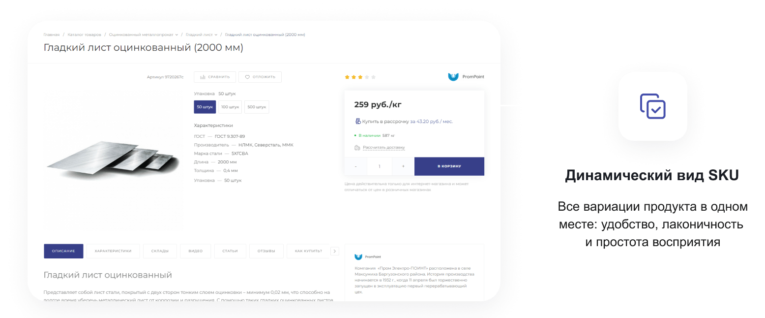 В решении есть все необходимое для сайта металлоторговых и промышленных компаний: от готовых контентных разделов и форм для записи до версии для слабовидящих и набора маркетинговых инструментов.