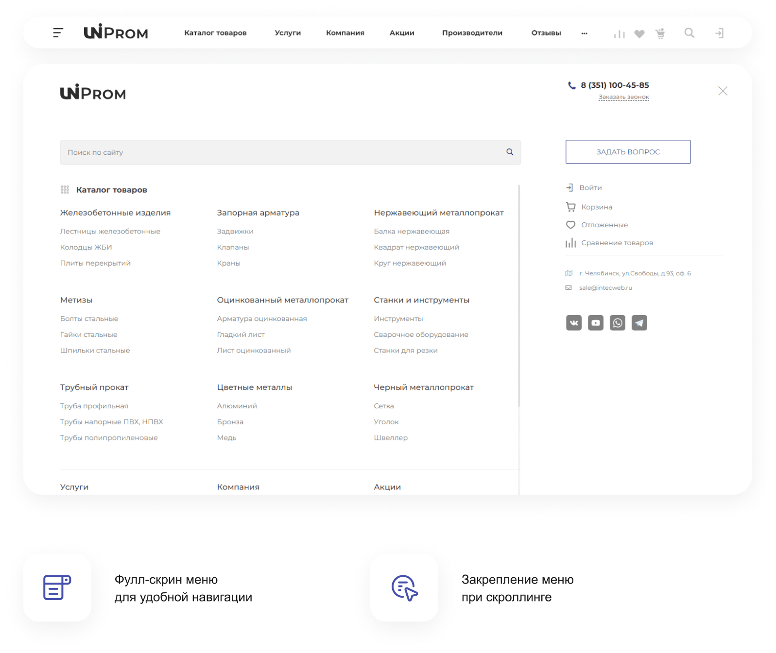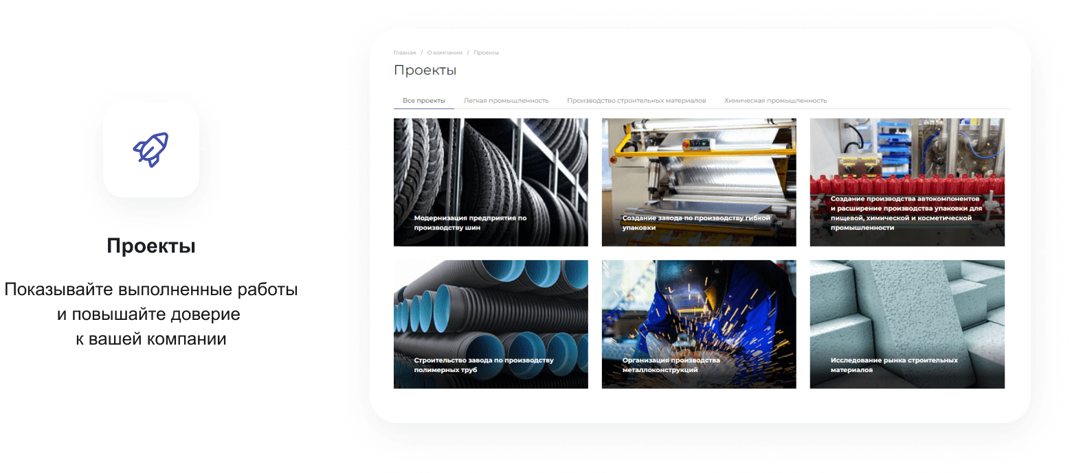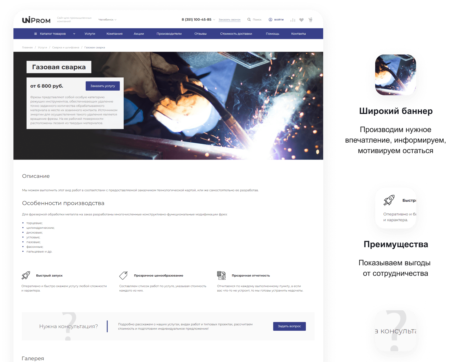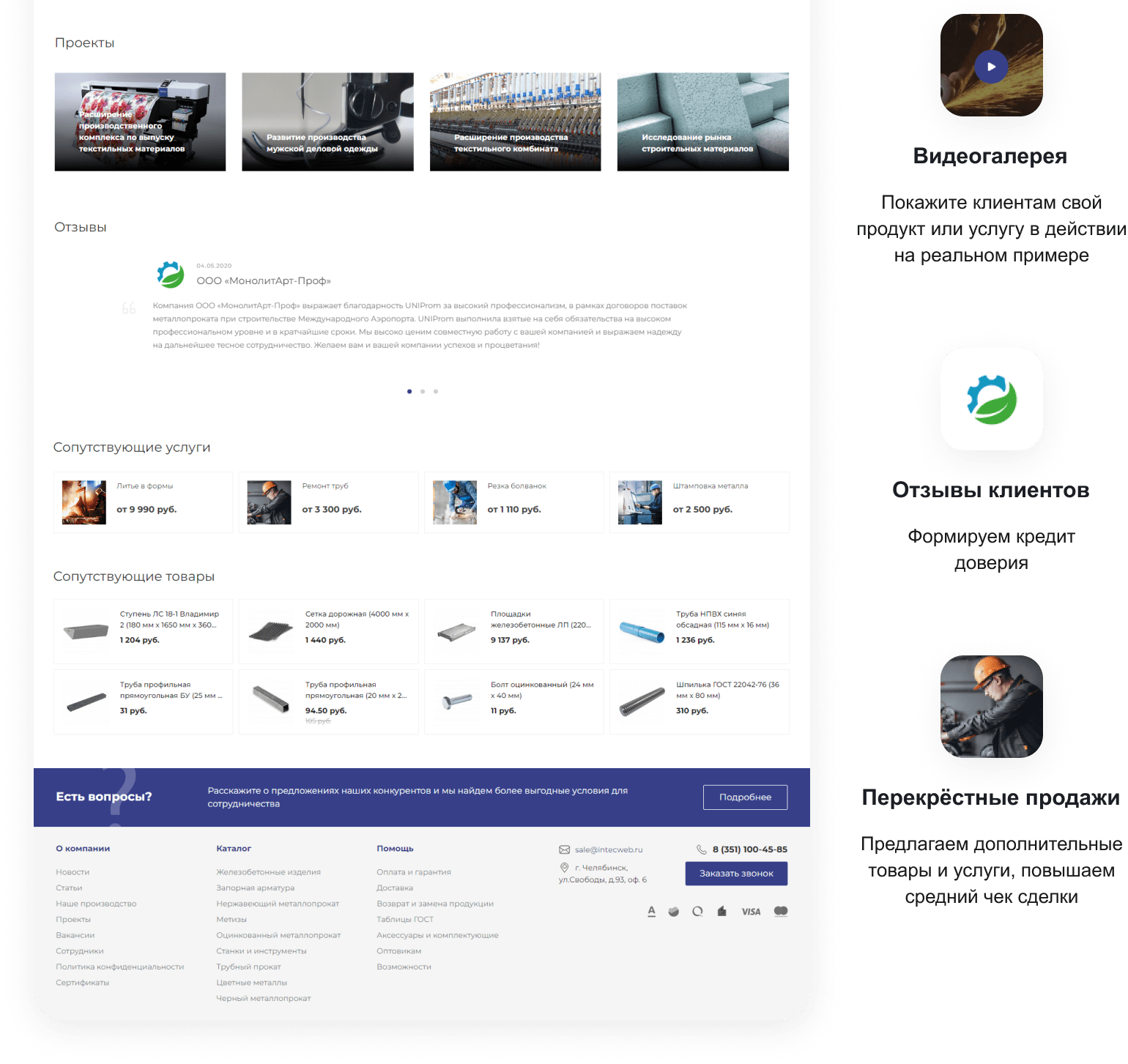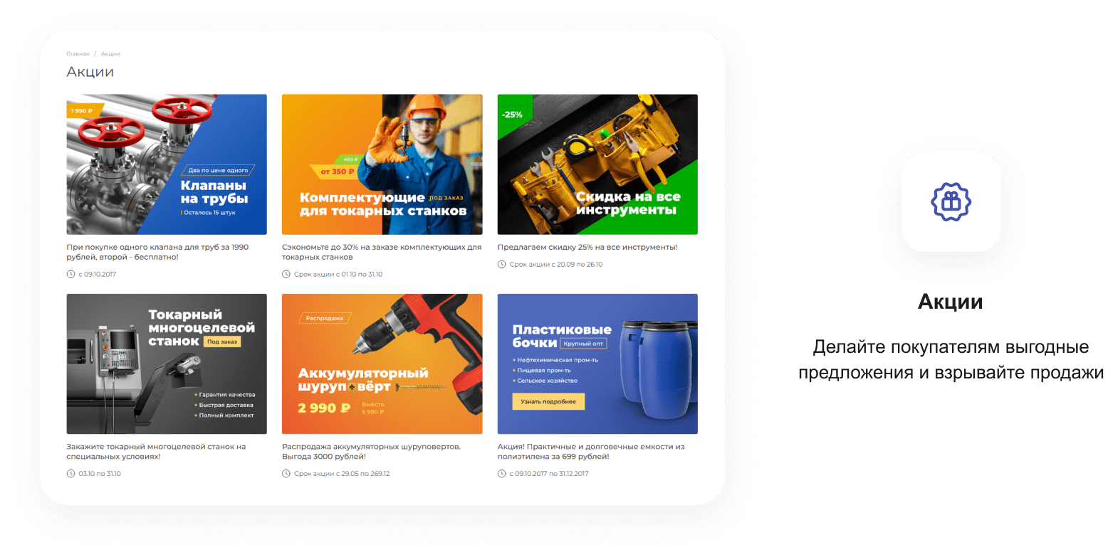В решении есть все необходимое для сайта металлоторговых и промышленных компаний: от готовых контентных разделов и форм для записи до версии для слабовидящих и набора маркетинговых инструментов.