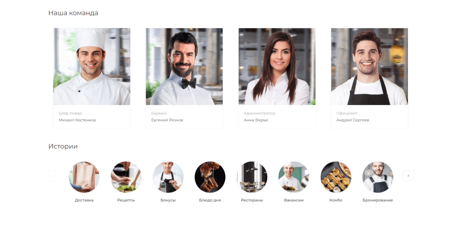 В решении есть все необходимое для сайта ресторана или службы доставки еды: от готовых контентных разделов и форм для записи до версии для слабовидящих и набора маркетинговых инструментов.