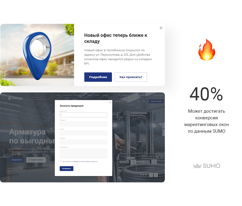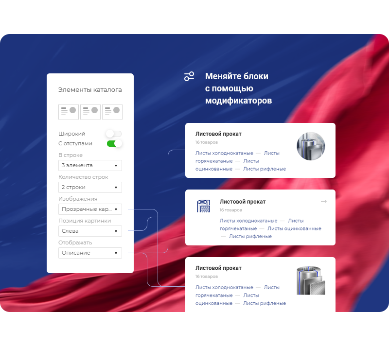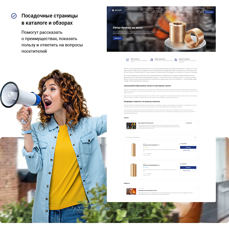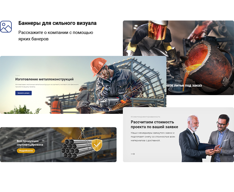 В решении есть все необходимое для создания промышленных компаний: от готовых контентных разделов и форм для записи до версии для слабовидящих и набора маркетинговых инструментов.