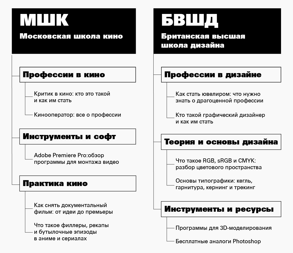 Материалы готовили вместе с преподавателями и методистами Университета — это добавляло пользы, но согласование занимало больше времени из-за занятости экспертов. Для сайта Британской школы дизайна подобрали более 130 тем, опубликовали 50 статей с участием спикеров. Для сайта МШК подобрали 42 темы, составили 22 ТЗ, написали и опубликовали 5 статей.