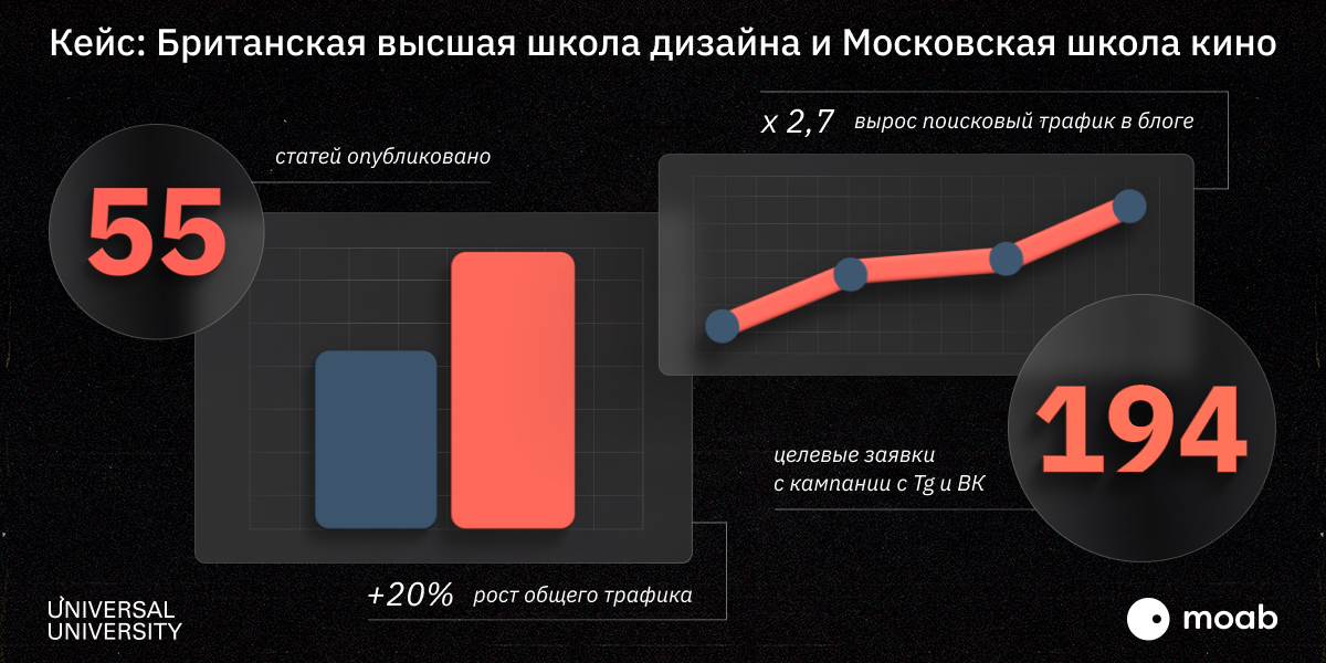 Редакция moab создавала статьи для двух направлений: БВШД и МШК. Подбирали темы для блогов так, чтобы статьи одновременно привлекали трафик и отражали экспертность преподавателей Университета.