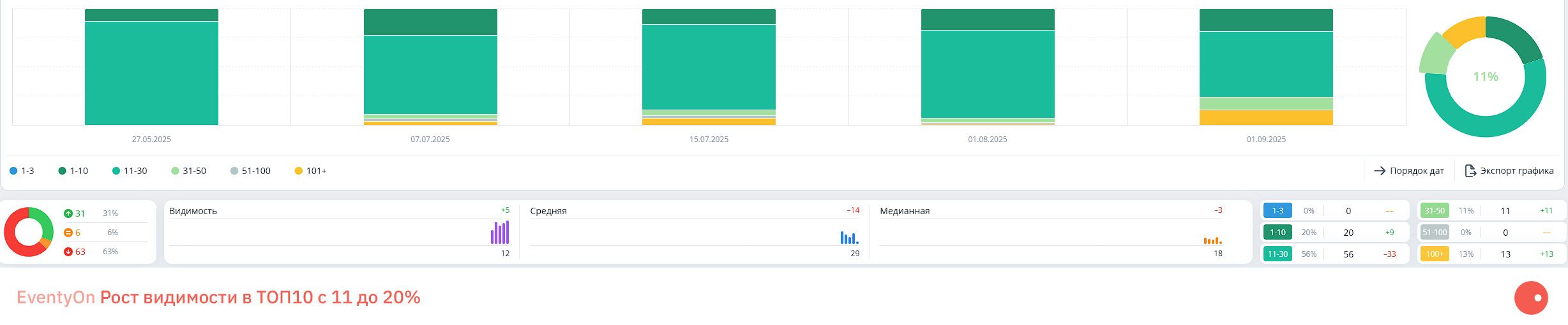 - EventyOn: рост видимости в ТОП10 с 11 до 20%.