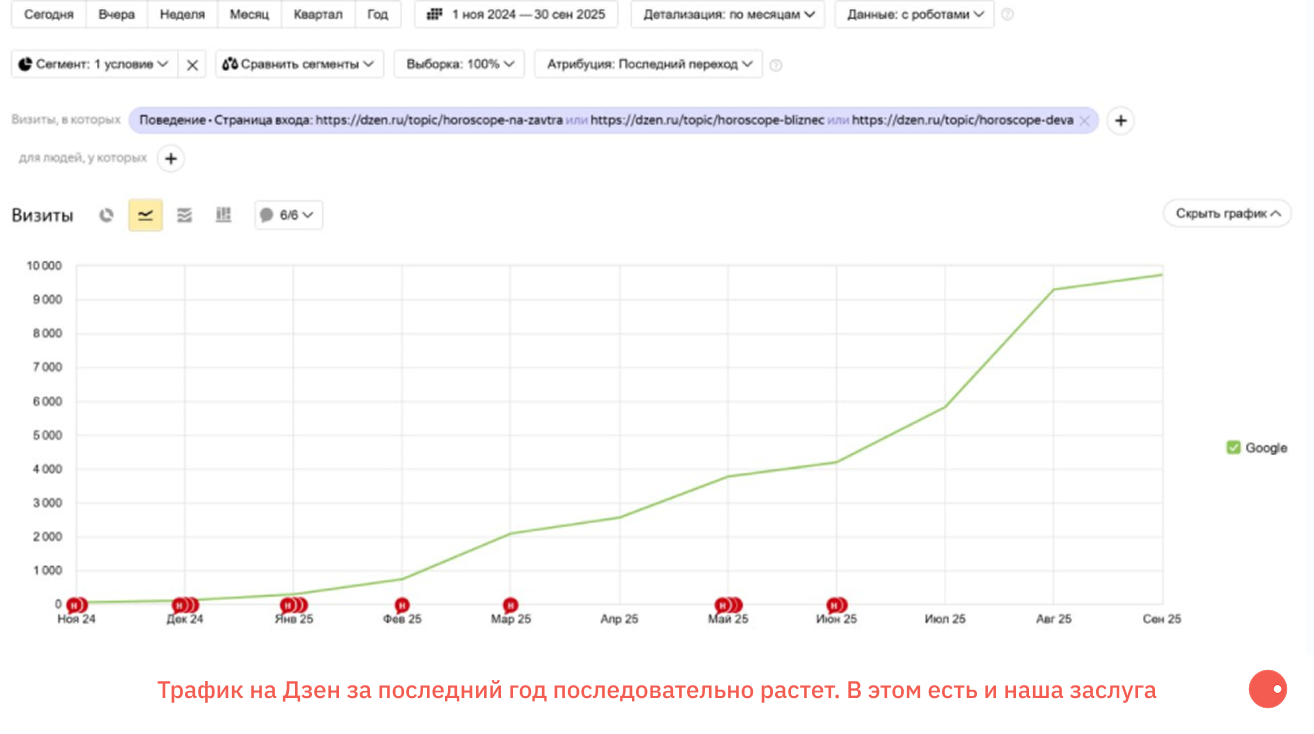 Мы выстроили полный цикл SEO-работ и массового производства контента с помощью ИИ. С нуля собрали и кластеризовали семантику по мета-каналам: до 6 млн ключей на одну тему. Оптимизировали существующие страницы и нашли «тематические дыры» в выдаче. Автоматизировали процесс генерации ТЗ на пике делали до 200 ТЗ в неделю (4 минуты на одно), всего подготовили 650+ ТЗ. Команда ИИ-редакции сгенерировала 3 300+ лонгридов по 12–20 тыс. знаков каждый и написала в нужном тоне Дзена и создала 340 ИИ-статей по темам «Красота» и «Технологии».
