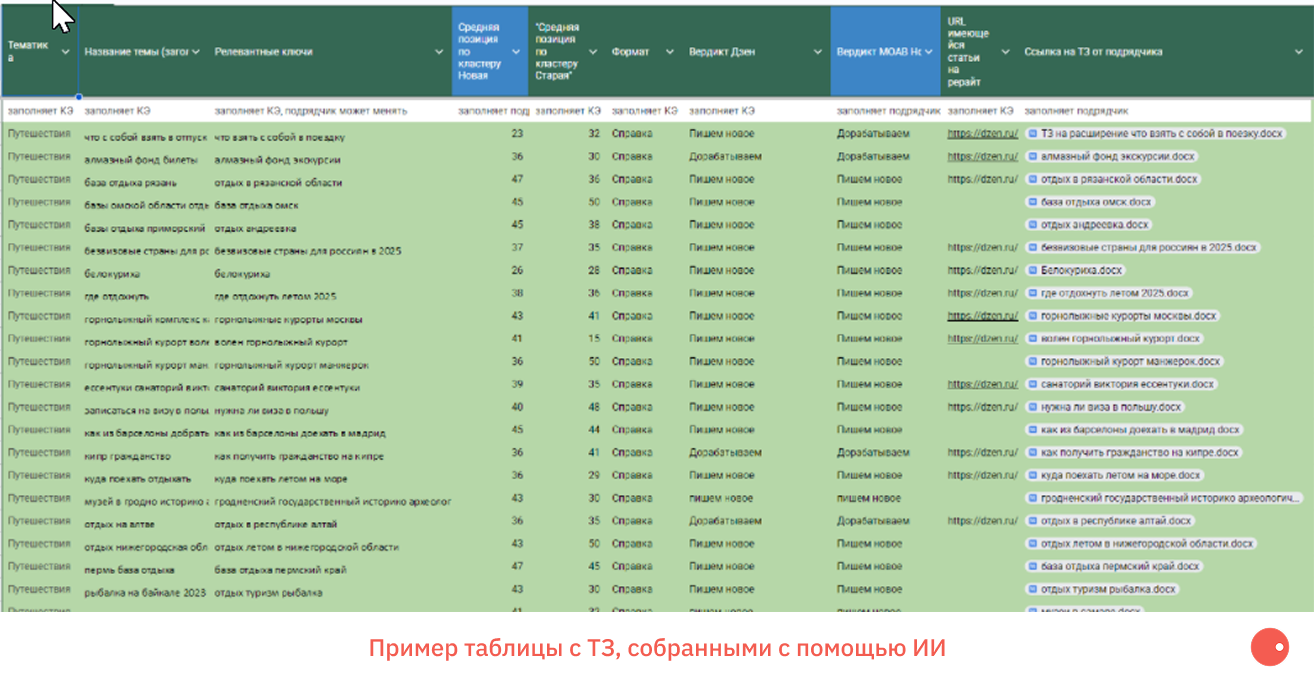 - Сгенерировали 3 300+ лонгридов по 12–20 тыс. знаков каждый, адаптированных под Tone of voice Дзена, с корректным форматированием и без «воды» и галлюцинаций.