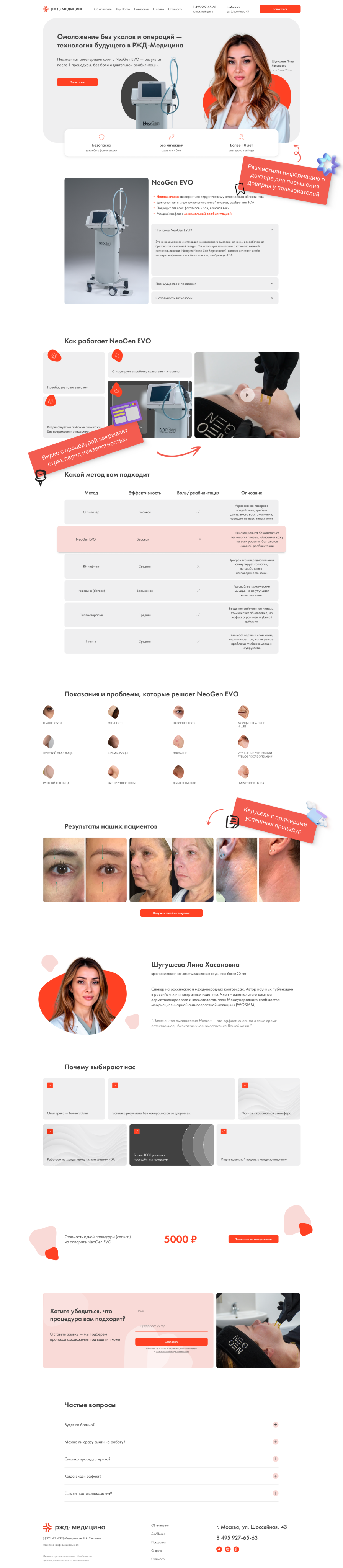 Для продвижения услуги плазменной регенерации кожи нужно было создать отдельный лендинг. Хотя это проект РЖД-Медицина, важно было не ориентироваться на стилистику сайта-исходника, а создать более свежий визуал, в то же время соблюдая требования брендбука компании.